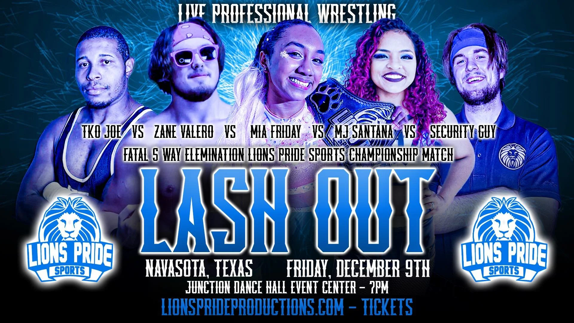 Friday scored the final fall in a classic five-person elimination match at Lash Out for her Lions Pride Sports Championship. It was long-time rival MJ SANTANA who fought her way to the final two, ultimately being driven into the mat by the teen champ for the victory. Former champion ZANE VALERO, SECURITY GUY and TKO JOE fought valiantly in the chaotic contest, but each fell short of the biggest prize in The Pride.